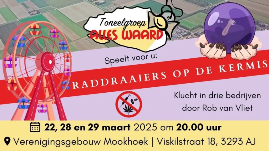 In maart 2025 viert Toneelgroep Alles Waard haar eerste lustrum met een bijzondere voorstelling. Speciaal voor deze gelegenheid heeft Rob van Vliet het hilarische stuk “Raddraaiers op de Kermis” geschreven, geheel afgestemd op de wensen van de toneelgroep.