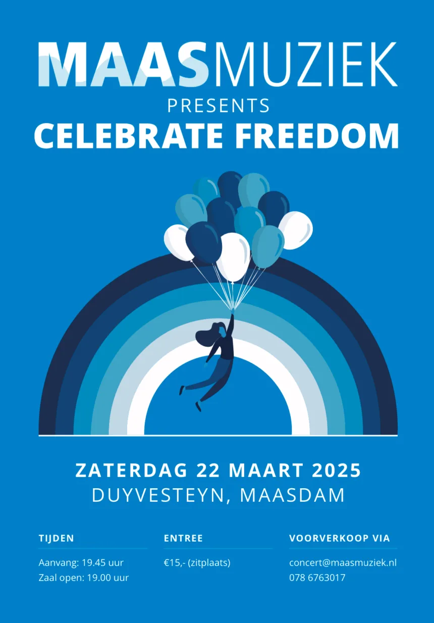 Celebrate Freedom, dat is het thema van de nieuwe editie van de concertserie “MaasMuziek Presents” van MaasMuziek uit Puttershoek. Dat kan ook niet anders, 80 jaar na de bevrijding. Onze vrijheid moeten we, in tijden dat oorlogen niet meer ver weg zijn en de tolerantie voor elkaar steeds moeilijker wordt, ook zeker vieren. Vieren dat we vrij zijn, in vrijheid mogen leven en je mag zijn wie je bent.