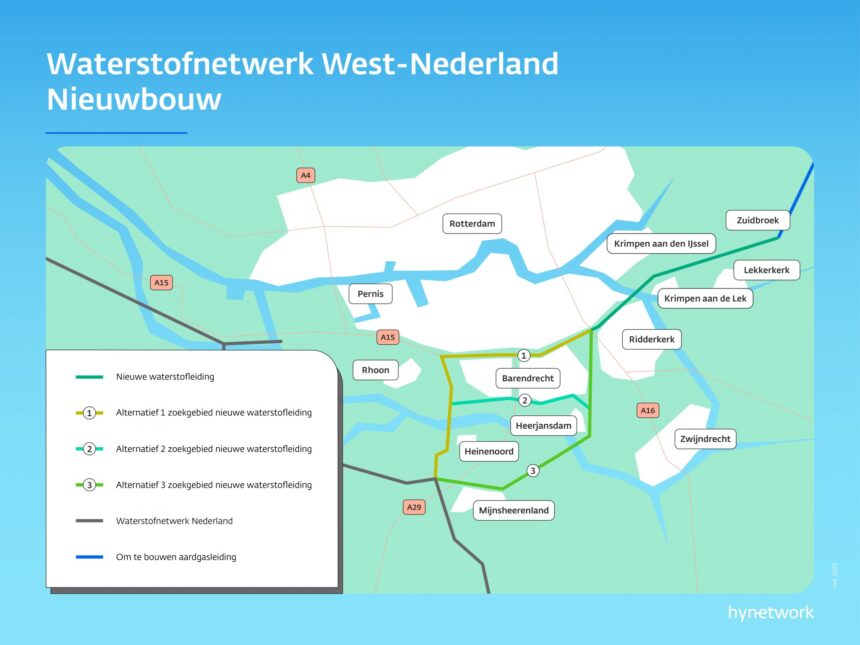 Tussen Zuidbroek en Mijnsheerenland komt een nieuwe waterstofleiding. In Mijnsheerenland sluit deze aan op de toekomstige leiding van de Delta Rhine Corridor, die ook onderdeel is van het landelijke waterstofnetwerk. Hynetwork onderzoekt 3 mogelijke routes voor de leiding tussen Zuidbroek en Mijnsheerenland. In een latere fase wordt duidelijk waar de leiding precies komt te liggen.