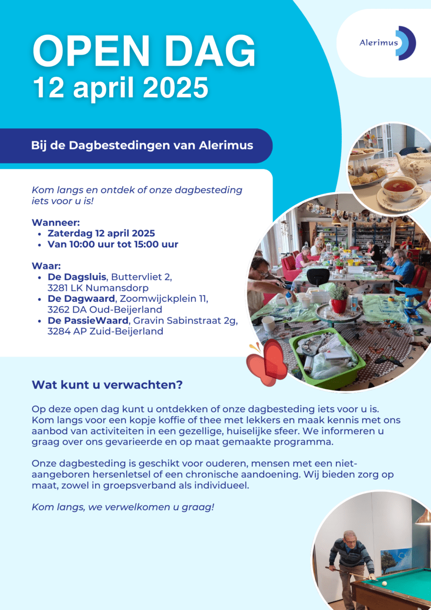 Op zaterdag 12 april zet Alerimus van 10:00 tot 15:00 uur de deuren van dagbesteding De Dagsluis, De Dagwaard en De PassieWaard open en kunt u kennismaken met het aanbod van activiteiten in een gezellige, huiselijke sfeer. De dagbesteding van Alerimus is geschikt voor ouderen, mensen met een niet-aangeboren hersenletsel of een chronische aandoening. Alerimus biedt zorg op maat, zowel in groepsverband als individueel.