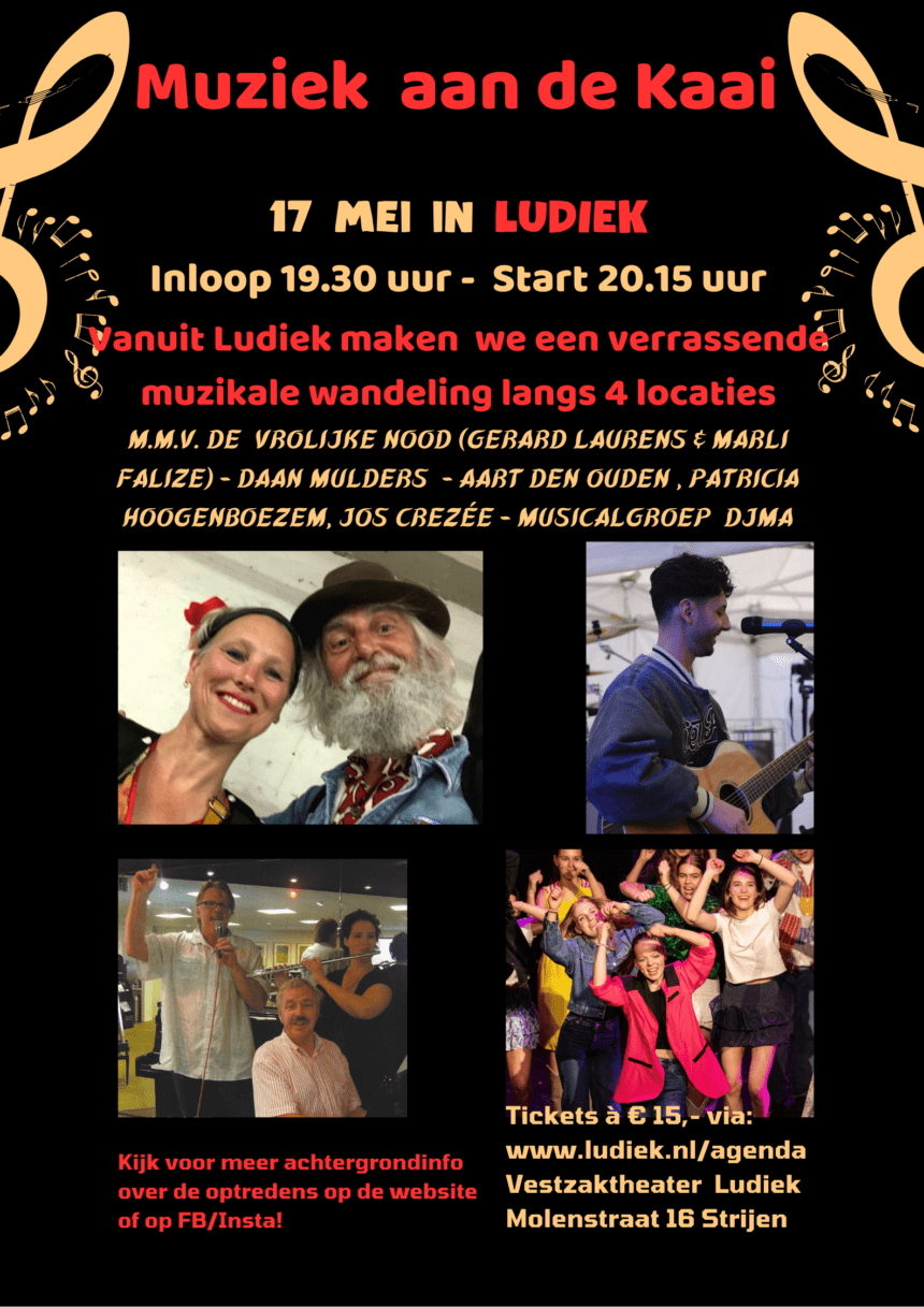 Na het grote succes van de vorige edities keert Muziek aan de Kaai terug – en hoe! Op zaterdagavond 17 mei verandert de Kaai in Strijen opnieuw in een sfeervolle route vol verrassende muzikale optredens, met als start- én eindpunt het gezellige Vestzaktheater Ludiek.