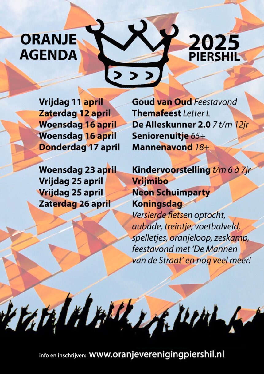 April staat in Piershil weer bomvol feest, plezier en gezelligheid voor jong én oud! Van dampende dansvloeren tot kleurrijke kinderactiviteiten, van gezellige vrijmibo’s tot feestavonden in spandex — het zit allemaal in ons feestelijke programma.Of je nu los wilt gaan op het Letterfeest, wilt strijden tijdens de Alleskunner 2.0 of samen met dorpsgenoten de Koningsdag groots wilt vieren: in Piershil is er elke dag iets te beleven. Dus blok je agenda, trek je mooiste feestoutfit uit de kast en vier het leven met ons mee!!