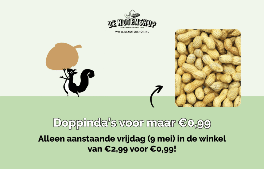 Alleen aanstaande vrijdag (9 mei) profiteer je van een heerlijke actie bij De Notenshop! Ga langs in de winkel en scoor de lekkerste doppinda’s voor slechts €0,99 in plaats van €2,99 per zak van 350 gram. Een unieke kans om voordelig te genieten van deze knapperige klassieker!