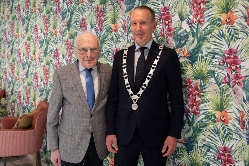 Vandaag is Arie den Hartog 102 geworden. Burgemeester Van Heijningen ging langs om hem te feliciteren met deze bijzondere mijlpaal. Namens het gemeentebestuur had hij een mooie bos bloemen en een doos bonbons meegenomen. Meneer Den Hartog is zelf 10 jaar burgemeester geweest. Herinneringen daaraan nam hij graag door met burgemeester Van Heijningen.