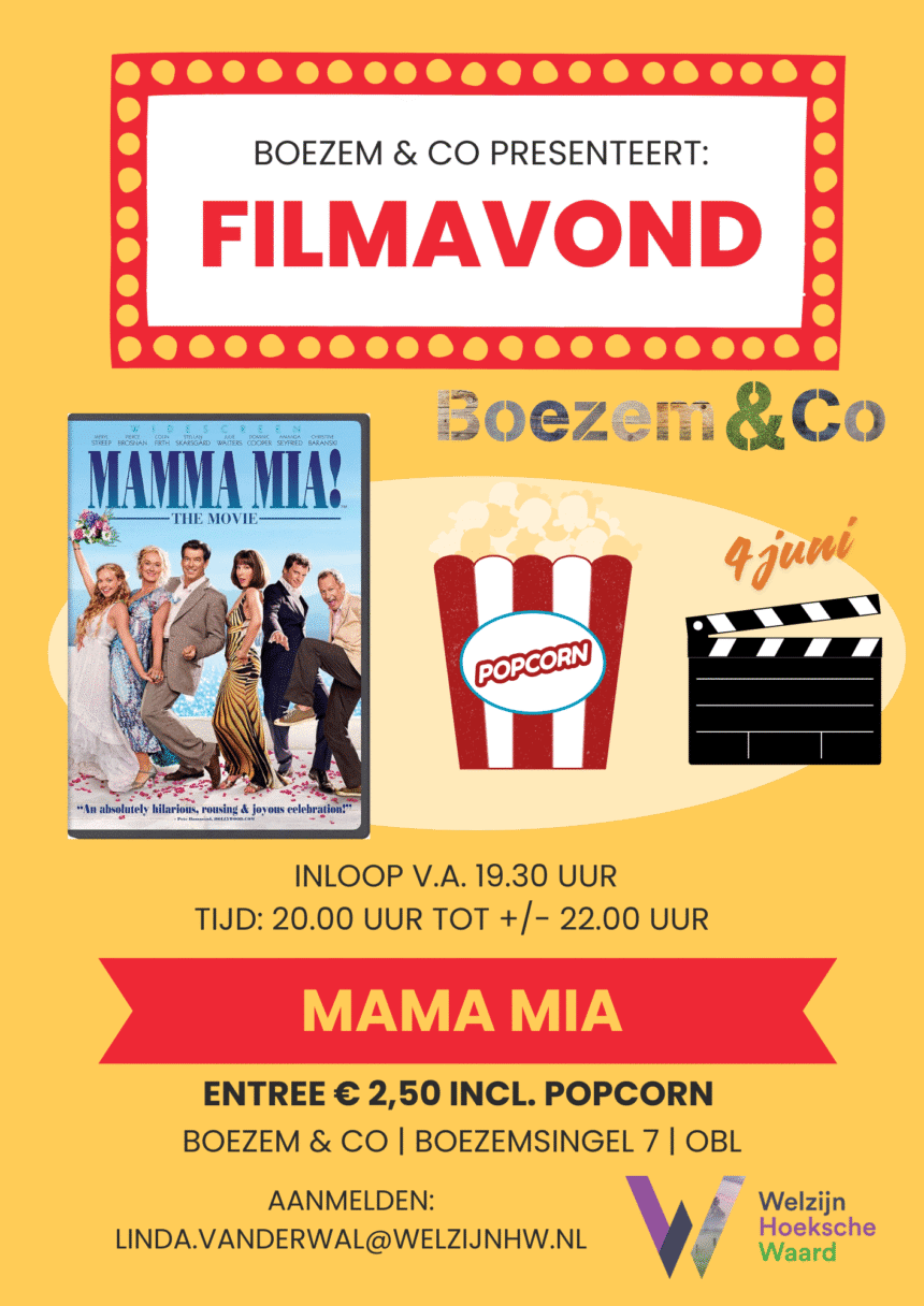 Woensdag 4 juni organiseren vrijwilligers van Welzijn Hoeksche Waard een gezellige filmavond in Boezem & Co. Iedereen is van harte welkom om samen te genieten van de vrolijke en muzikale film Mamma Mia.