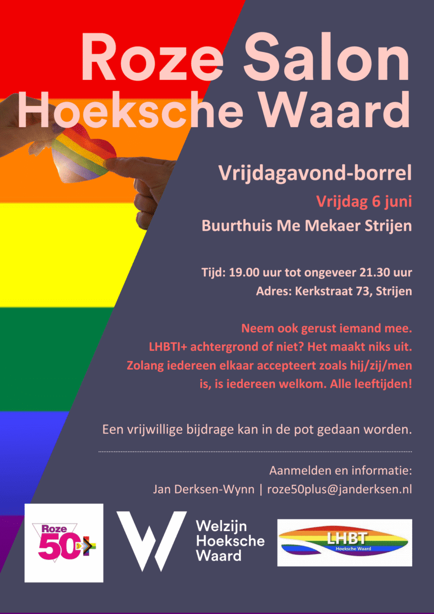 Strijen – Op vrijdag 6 juni staat er weer een kleurrijke en gezellige avond op de agenda: de Roze Salon, dé regenboogborrel voor LHBTI’ers en iedereen die zich betrokken voelt. Deze keer vindt de bijeenkomst opnieuw plaats in Buurthuis Me Mekaer aan de Kerkstraat 73 in Strijen.