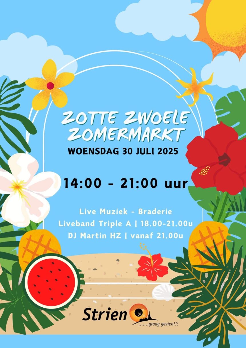De zomer wordt op woensdag 30 juli uitbundig gevierd tijdens de Zotte Zwoele Zomermarkt in Strijen! Van 14:00 tot 21:00 uur verandert het centrum in een sfeervolle braderie vol muziek, lekkernijen, zomerse sfeer en gezelligheid voor jong en oud.