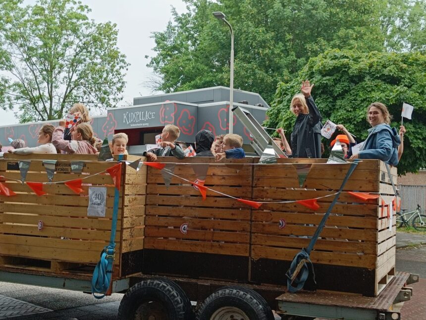 Vandaag werd er uitgebreid stilgestaan bij dit prachtige jubileum. Vanmorgen verzamelde haar groep 5 zich bij een collega op de boerderij en stapte iedereen achterin een grote kar om de juf thuis op te halen. Vanaf daar trok de aanhanger veel bekijks op weg naar school. Daar vormden alle kinderen een lange haag om de juf met gezang en vlaggetjes te onthalen. Met haar klas liep ze daarna de Marwanto, een alternatieve Biwanto (waar ze vorig jaar ook al haar jubileum liep) langs allerlei bijzondere plekken in het dorp die betekenis hebben voor de juf in die afgelopen 40 jaar. Zo werd de sporthal niet overgeslagen! De juf heeft ook al heel lang turnlessen verzorgd en wedstrijden gejureerd dus er moest met haar groep ook nog even geturnd worden. De juf houdt ook heel erg van Chinees eten, dus moest er ook een loempia gehaald worden. Het geloof speelt eveneens een grote rol in het leven van de juf en daarom werd er ook een stop gepland bij de Ned.Herv.Kerk op De Heul, waar een lied van Elly en Rikkert werd gezongen. De rest van de schooltijd werd het heel gezellig in Marjo’s klas en na schooltijd was er een high borrel met alle collega’s.