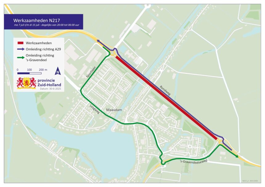 De provincie Zuid-Holland werkt van 7 tot en met 15 juli 2025 aan de N217 bij Maasdam. De weg is tijdens de werkzaamheden (tussen 20.00 en 06.00 uur) afgesloten. Het verkeer volgt dan omleidingen. Overdag is de weg open voor verkeer.