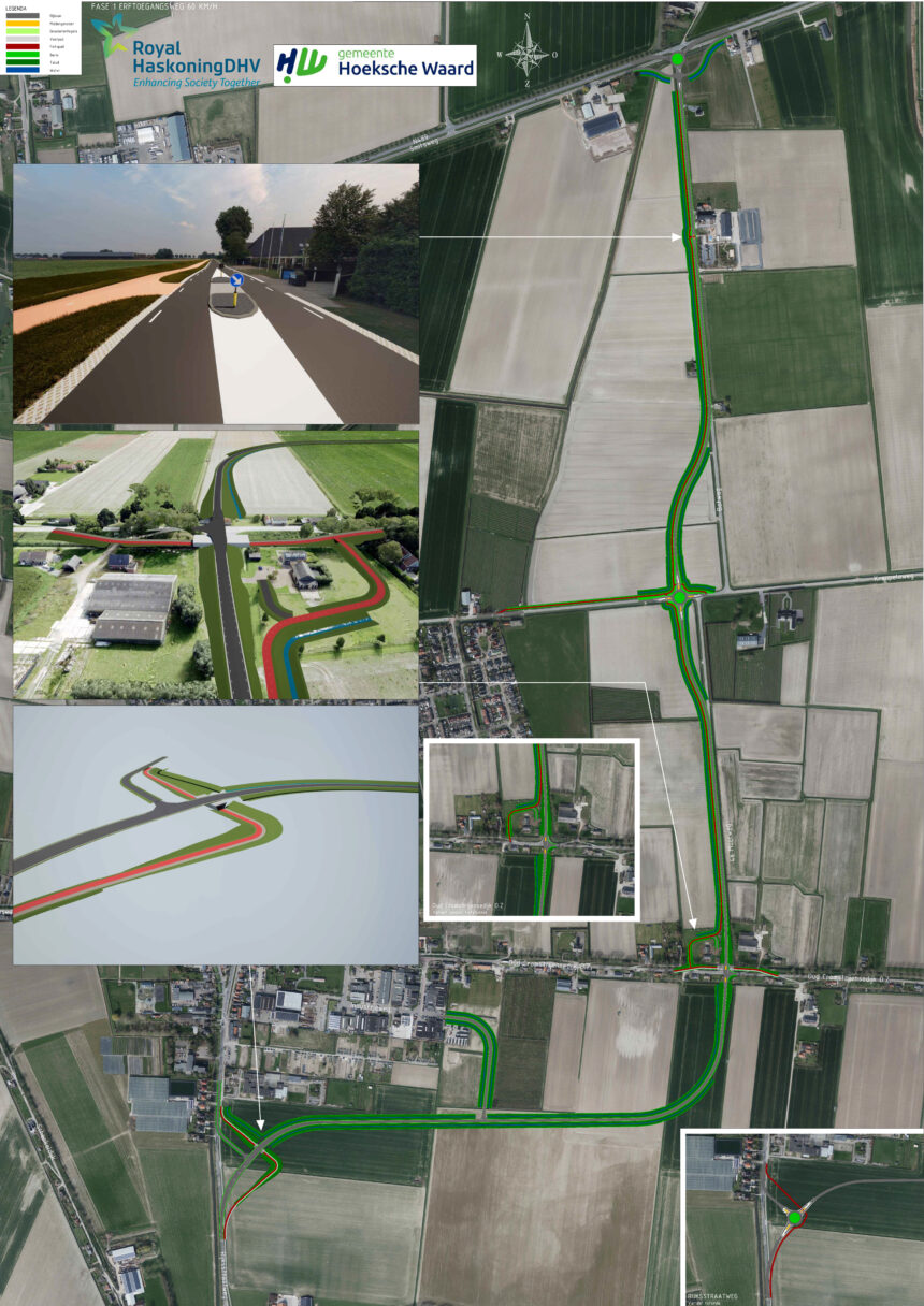 Naast het ontwerp van de korte randweg brachten wij het ruimtegebruik in beeld van een mogelijk toekomstige verlengde randweg 80 km/uur. De verbindingsweg aan de zuidkant van Klaaswaal wordt met een rotonde op de randweg aangesloten. De randweg wordt verdiept aangebracht bij de kruising met de Boomdijk en bij de aansluiting op de Energieweg is rekening gehouden met een rotonde.