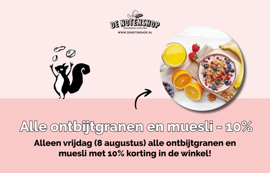 Ga vrijdag langs en profiteer van 10% korting op alle ontbijtgranen en muesli in de winkel! Dit weekend kan jouw ontbijt niet meer stuk. Wat ga jij kiezen?