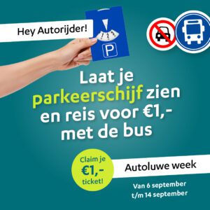 Van 6 t/m 14 september kunnen automobilisten in de Hoeksche Waard en op Goeree-Overflakkee bijna voor niets met de bus reizen. Busvervoerder Connexxion organiseert de actie ‘Hier met je parkeerschijf!’ om meer automobilisten te laten ervaren hoe gemakkelijk en duurzaam het openbaar vervoer kan zijn.Wie vooraf een e-ticket claimt voor €1,00 via connexxion.nl/autoluweweek, hiermee incheckt en bij het instappen de parkeerschijf toont aan de chauffeur, kan voordelig op pad.