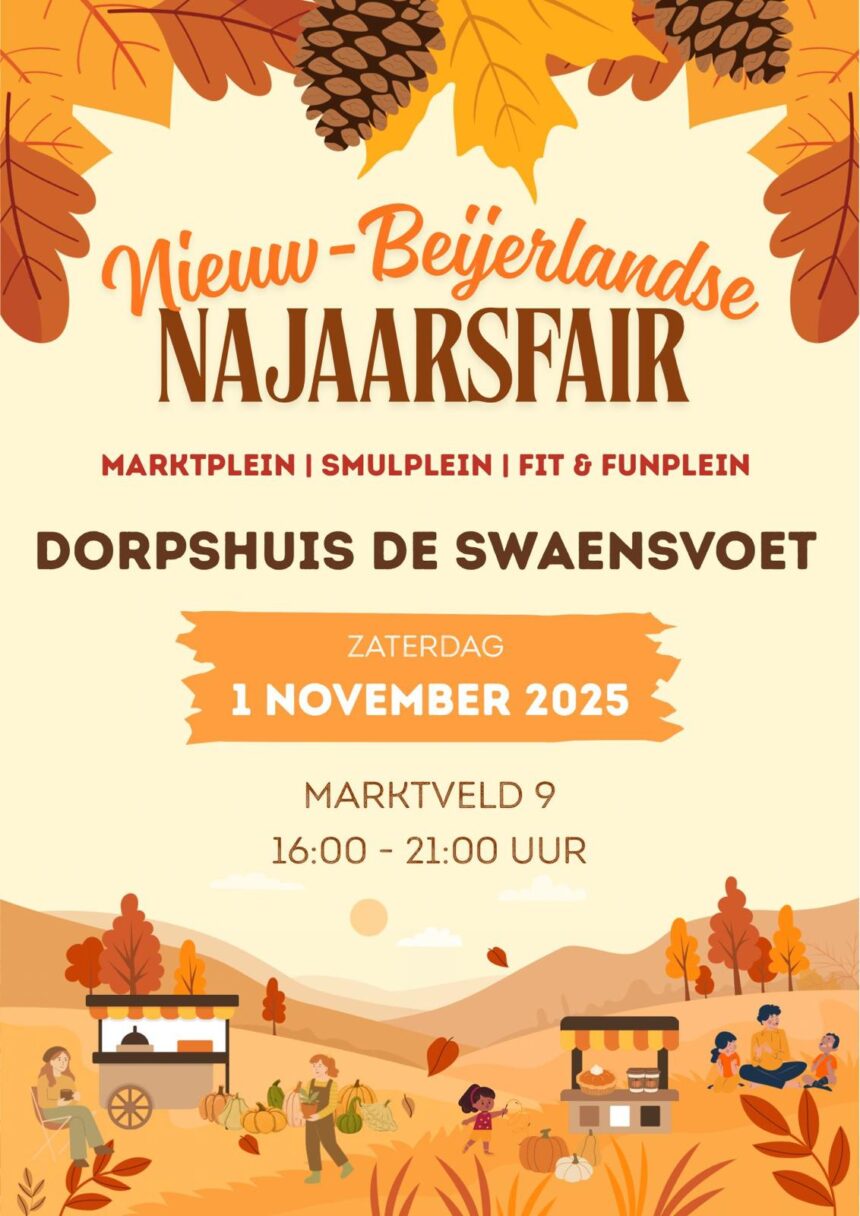 Nieuw-Beijerland – Op zaterdag 1 november 2025 vindt in dorpshuis De Swaensvoet de Nieuw-Beijerlandse Najaarsfair plaats. Van 16.00 tot 21.00 uur kunnen bezoekers genieten van een sfeervolle herfstmarkt vol activiteiten, lekkernijen en lokale producten.