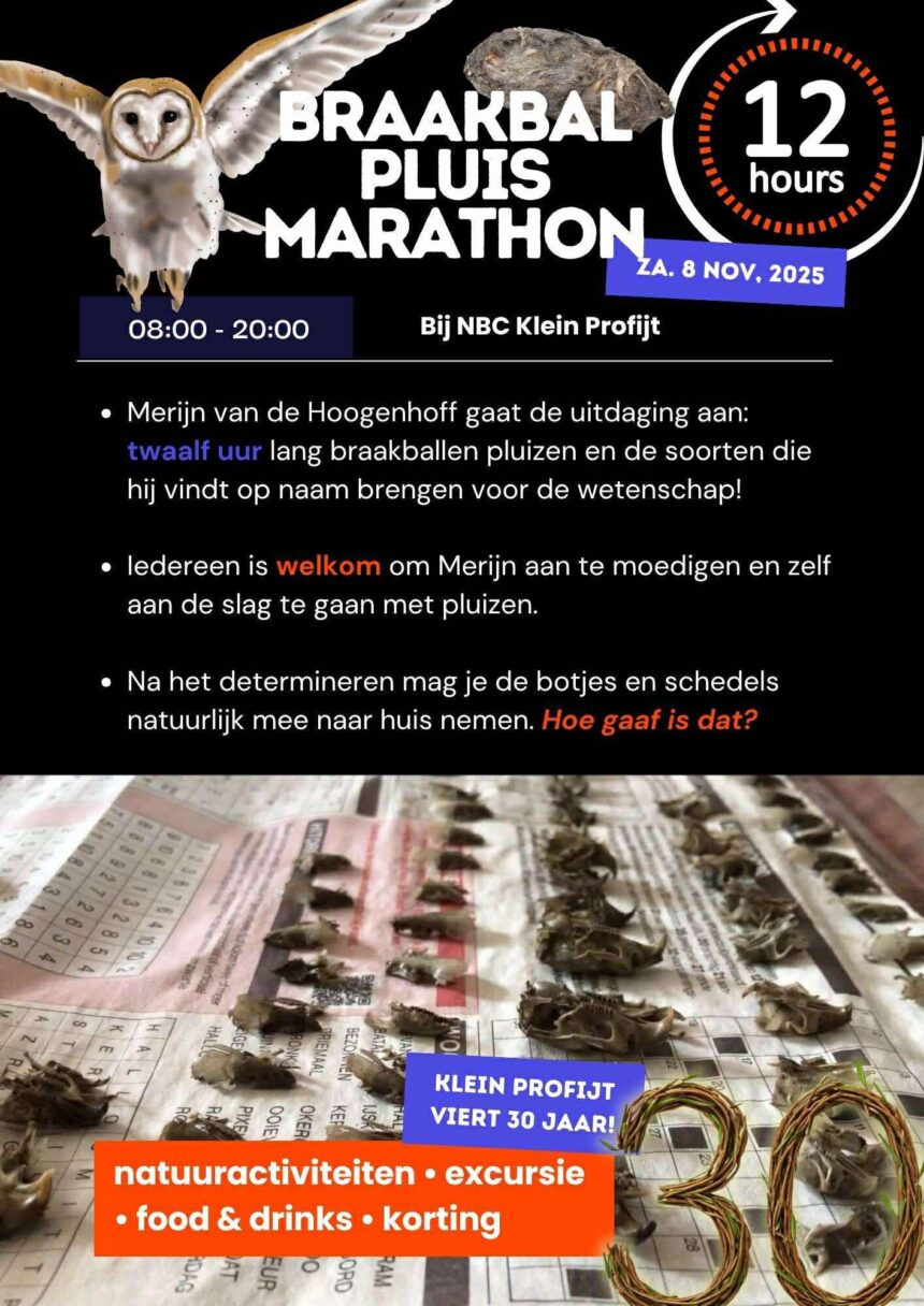 Oud-Beijerland – Op zaterdag 8 november 2025 organiseert Natuur Bezoekerscentrum Klein Profijt een wel heel bijzondere natuuruitdaging: de Braakbalpluismarathon. Twaalf uur lang – van 08.00 tot 20.00 uur – gaat natuurexpert Merijn van de Hoogenhoff onafgebroken braakballen pluizen. Zijn doel: zoveel mogelijk prooidieren determineren en op naam brengen voor de wetenschap.