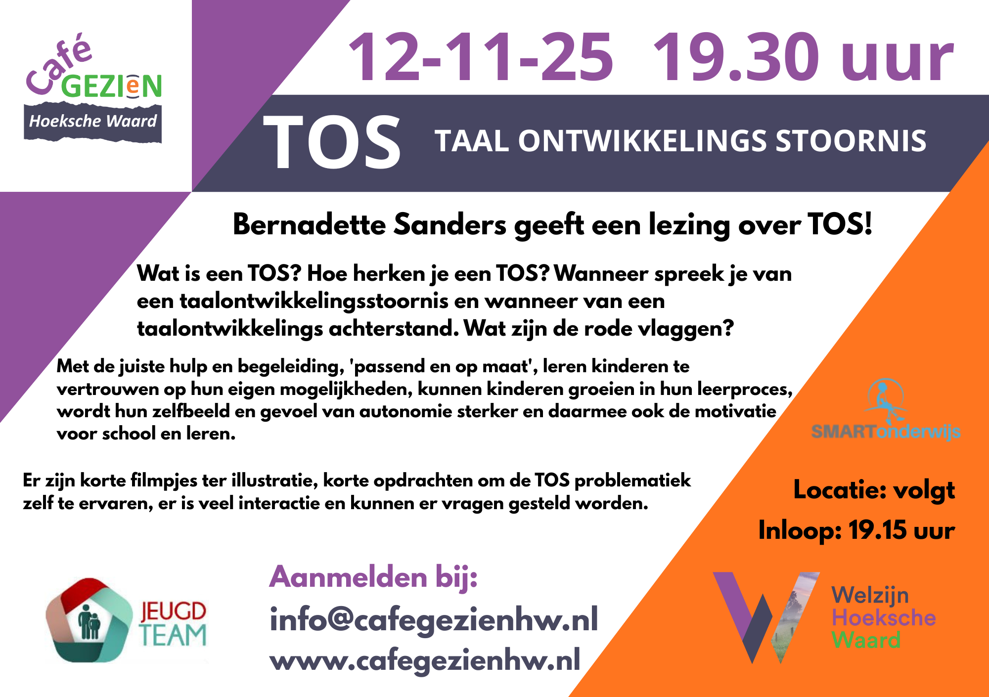 Wat is een TOS precies? Hoe herken je het? En wat is eigenlijk het verschil tussen een taalontwikkelingsstoornis en een taalontwikkelingsachterstand? Tijdens de bijeenkomst gaat Bernadette Sanders – die jarenlange ervaring heeft met kinderen met een TOS – in op deze vragen. Zij deelt haar kennis en praktijkervaring op een verhelderende en leerzame manier. Café GEZIeN HW is er trots op dat zij deze avond als gastspreker aanwezig is.