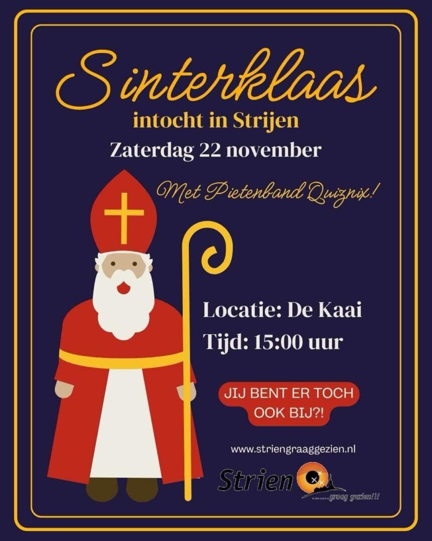 Op zaterdag 22 november komt Sinterklaas weer aan in Strijen! De goedheiligman wordt om 15.00 uur op De Kaai feestelijk verwelkomd in de haven van Strijen samen met de vrolijke Pietenband Quizpix. Natuurlijk zijn alle kinderen, ouders en grootouders van harte welkom om Sinterklaas en zijn Pieten te begroeten.