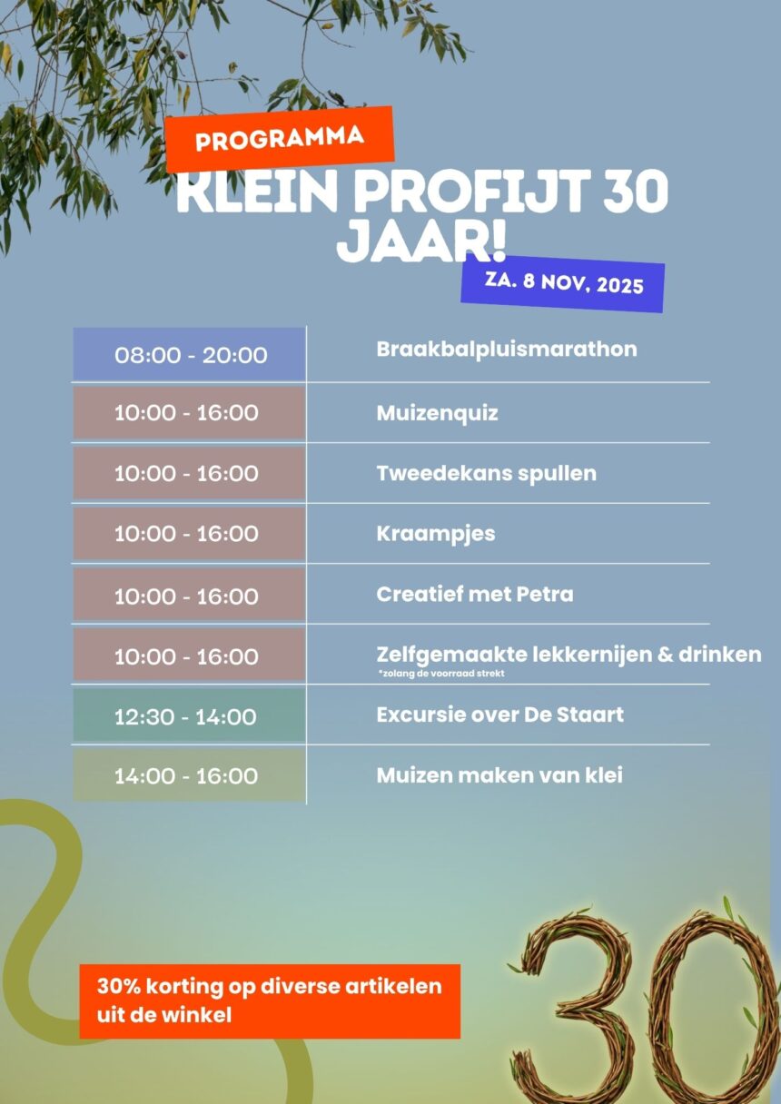 Op zaterdag 8 november viert de vereniging Hoekschewaards Landschap (HWL) het 30 jarig bestaan van Natuurbezoekerscentrum (NBC) Klein Profijt, prachtig gelegen aan de Oude Maas tussen Oud-Beijerland en Goidschalxoord. Ooit gebouwd als zalmvisserij, buiten gebruik geraakt, gekraakt en gesloopt door vandalisme en brandstichting. Met hulp van de toenmalige gemeente Oud-Beijerland en MARS kon HWL pand van de slopershamer redden met heel veel vrijwilligers en sponsoren omtoveren het gebouw wat het nu al 30 jaar is. Een gebouw met vele functies: plaats waar de leden van HWL ontmoeten en vergaderen, waar jaarlijks duizenden kinderen natuurlessen krijgen, vaste en wisselende natuur- en landschap tentoonstellingen, officieel Toeristisch Overstappunt (TOP) en horecagelegenheid met prachtig terras.