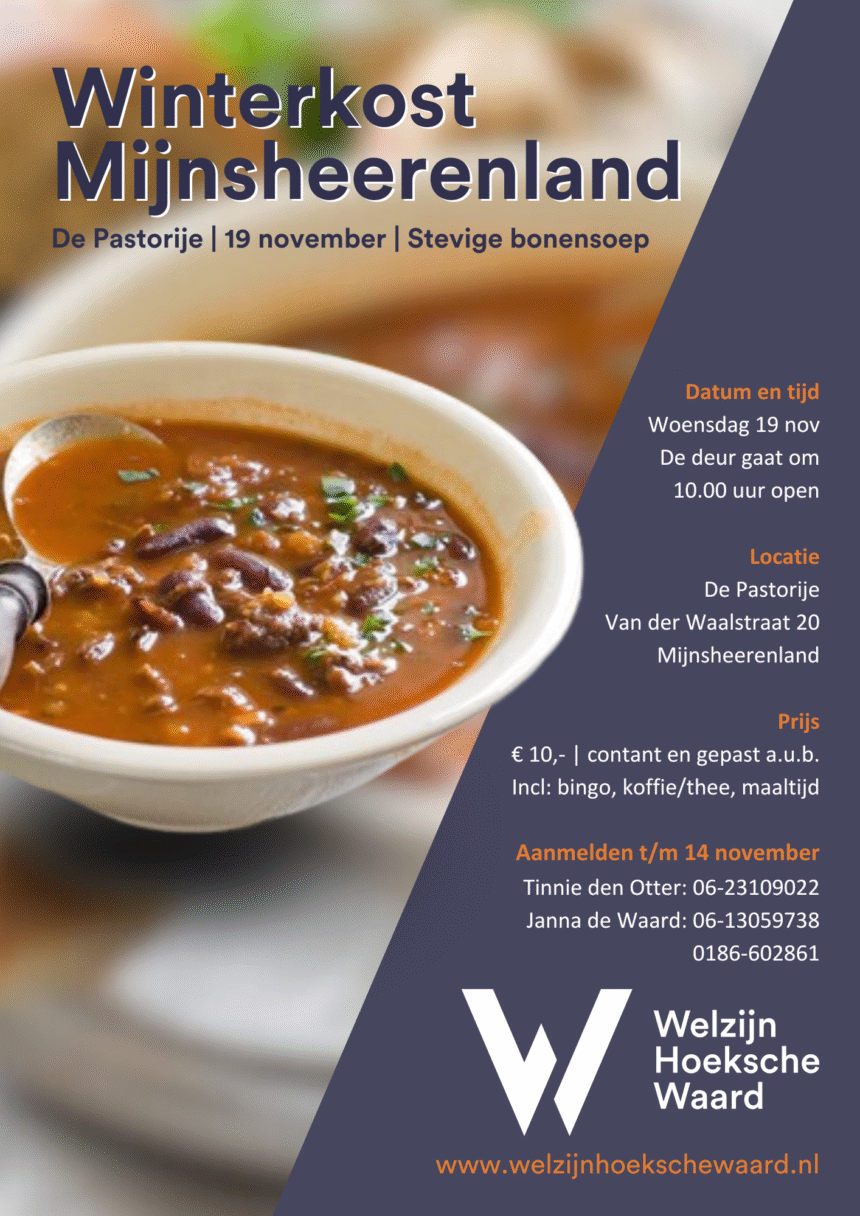 Op woensdag 19 november is het weer tijd voor Winterkost in de Pastorije aan de Van der Waalstraat 20 in Mijnsheerenland. Deze gezellige activiteit wordt georganiseerd door een enthousiaste groep vrijwilligers van Welzijn Hoeksche Waard en is speciaal bedoeld voor 55-plussers uit de omgeving.