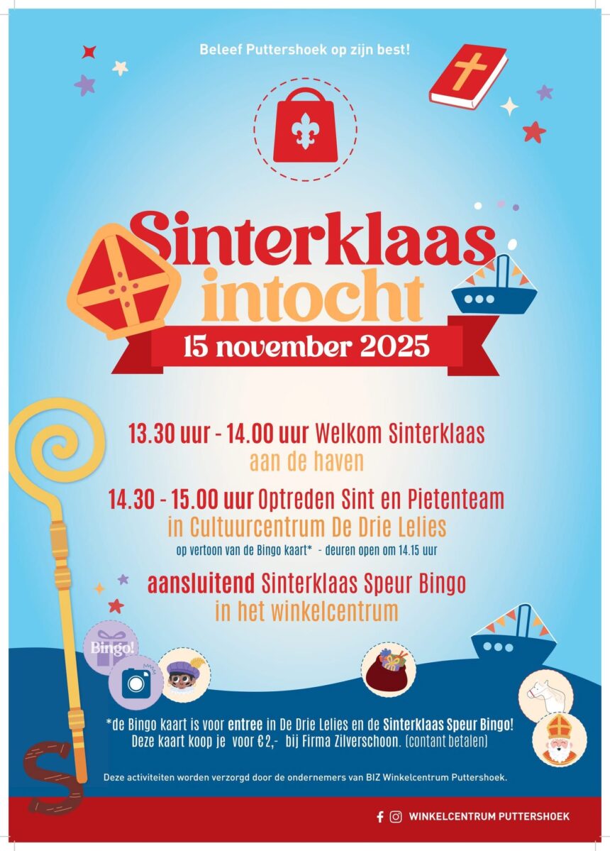 🎶 14.30 – 15.00 uur: Optreden van de Sint en het Pietenteam in Cultuurcentrum De Drie Lelies. Kaartjex te koop bij firma Zilverschoon.