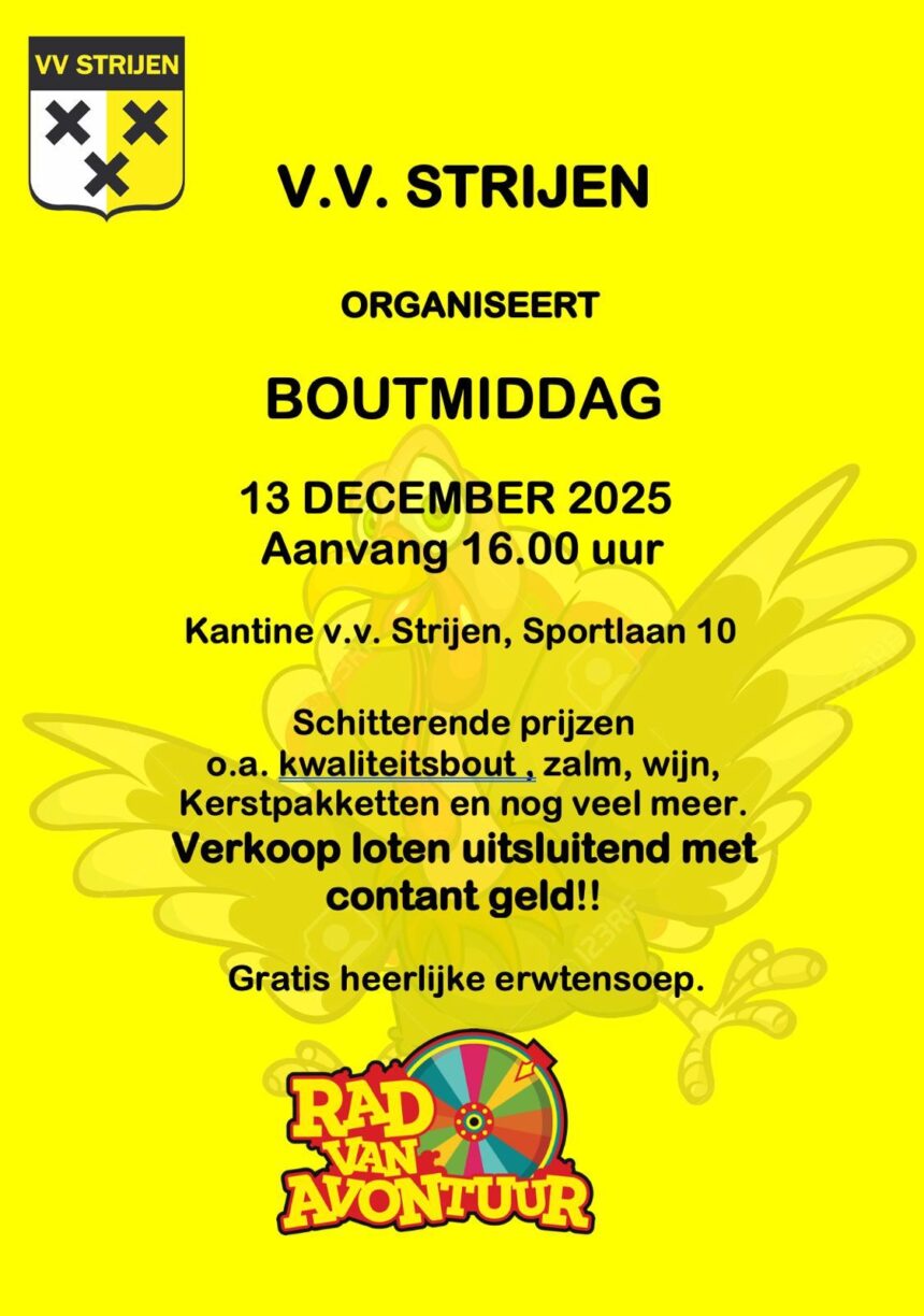 V.V. Strijen houdt op zaterdag 13 december 2025 weer de jaarlijkse Boutmiddag. De activiteit start om 16.00 uur in de kantine aan de Sportlaan 10 in Strijen. Tijdens deze gezellige middag maken bezoekers kans op prachtige prijzen bij het Rad van Avontuur.