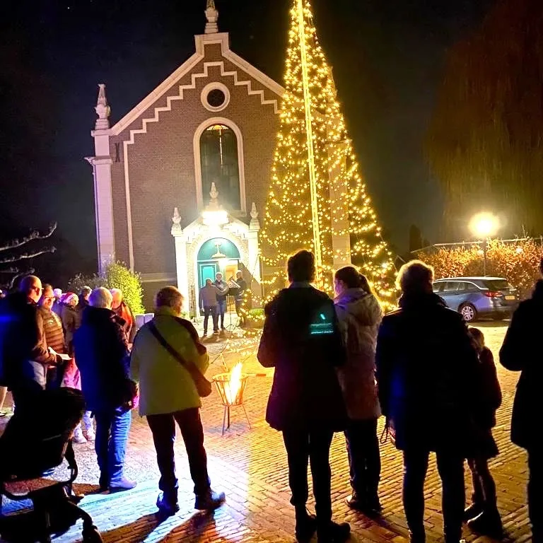 De deuren van de kerk staan open voor iedereen. Bezoekers kunnen genieten van warme chocolademelk en kerstkransjes, terwijl de verlichting van de kerstboom het plein in een echte kerstsfeer zet.