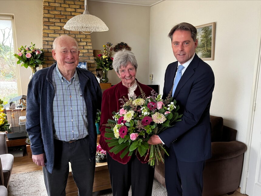 Het is vandaag, 29 december, precies 60 jaar geleden dat meneer C. Bax en mevrouw N. Bax-Zilverschoon (beiden 85) uit Maasdam in het huwelijksbootje stapten. Wethouder Paul Boogaard ging vanochtend langs met een mooie bos bloemen. Hij feliciteerde hen namens het gemeentebestuur met dit diamanten jubileum.