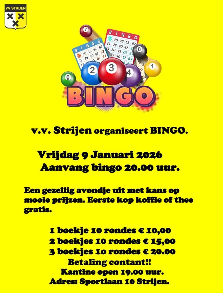 v.v. Strijen houdt op vrijdag 9 januari 2026 een gezellige bingoavond in de kantine aan de Sportlaan 10 in Strijen. De bingo start om 20.00 uur, de kantine is open vanaf 19.00 uur.