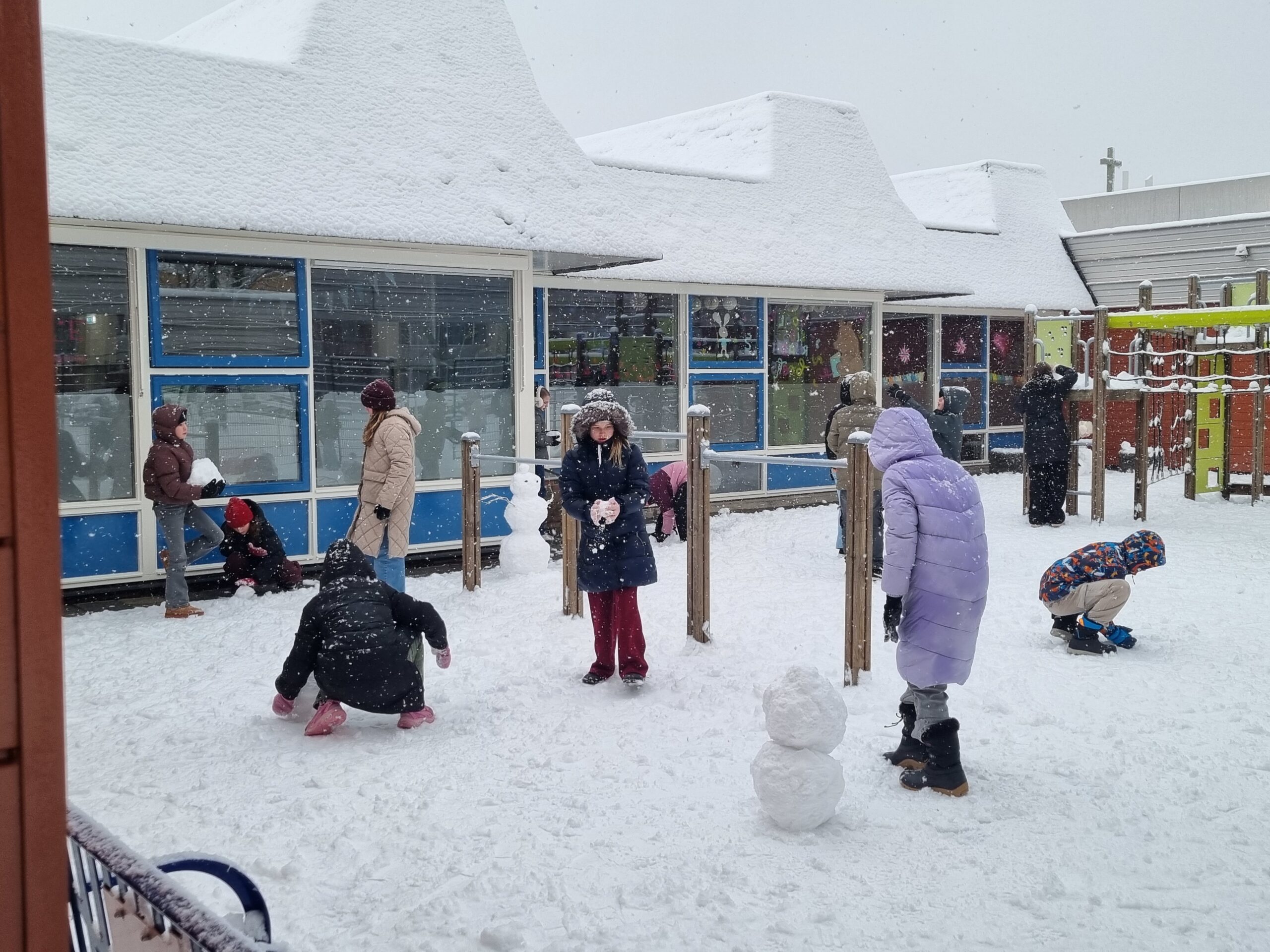 Op het schoolplein van De Bouwsteen in ’s-Gravendeel genoten kinderen uit alle groepen volop van de winterse omstandigheden. Er werden sneeuwpoppen gemaakt, sneeuwballengevechten gehouden en vooral veel gelachen.