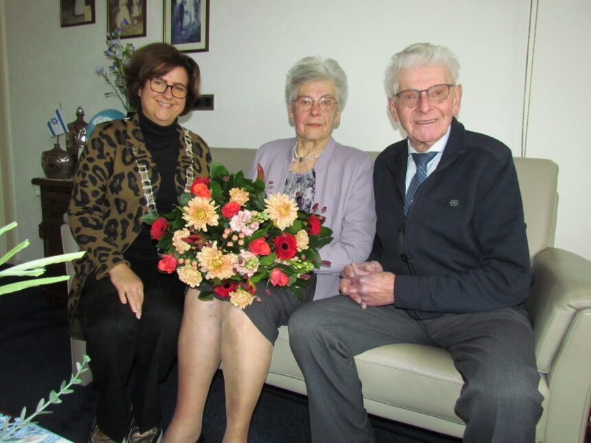 Het was maandag 12 januari 65 jaar geleden dat meneer M.A. Hitzert (90) en mevrouw P. Hitzert-Steenhoek (87) uit Strijen in het huwelijksbootje stapten. Burgemeester Marian Witte ging gisterenochtend langs met een mooie bos bloemen. Zij feliciteerde hen namens het gemeentebestuur met dit briljanten jubileum.