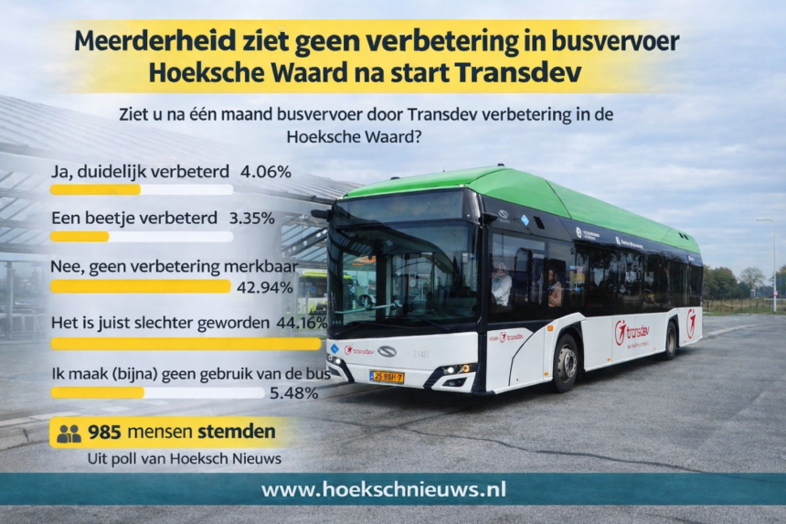 HOEKSCHE WAARD – Een ruime meerderheid van de deelnemers aan de poll van Hoeksch Nieuws is ontevreden over het busvervoer in de Hoeksche Waard, een maand na de start van vervoerder Transdev. Uit de resultaten blijkt dat veel reizigers geen verbetering ervaren, of zelfs vinden dat de situatie is verslechterd.