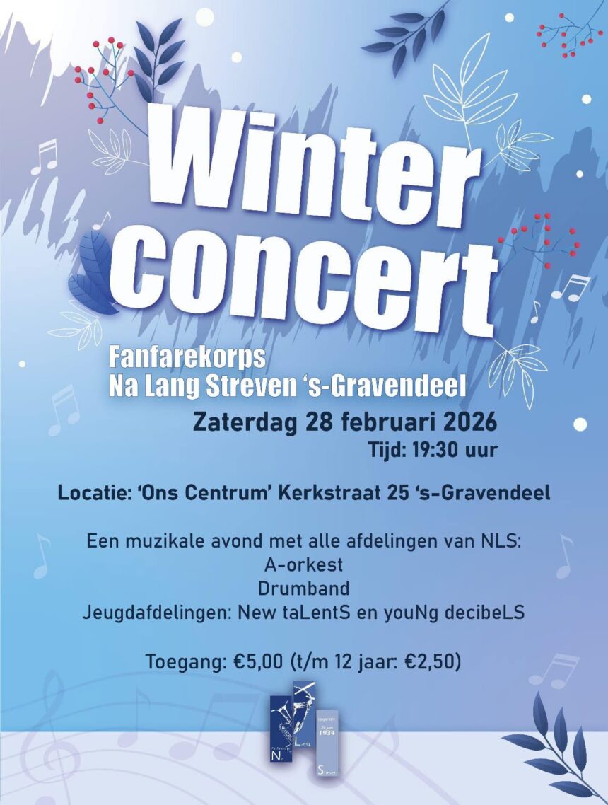 Fanfarekorps Na Lang Streven uit ‘s-Gravendeel geeft een winterconcert op zaterdagavond 28 februari.Het belooft een afwisselend concert te worden met medewerking van alle afdelingen van NLS: het fanfareorkest, de drumband en de jeugdafdelingen ‘New Talents’ (jeugdorkest) en ‘Young Decibels’ (jeugddrumband).