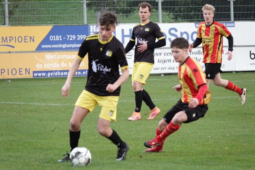 Op het middenveld werden ondertussen stevige duels uitgevochten, soms op het randje en af en toe eroverheen. Strijen hield echter het overwicht en werd daar in de 24e minuut voor beloond. Calvin wist David te bereiken, die richting het doel kon opstomen en de bal via de paal binnen schoot: 0-1.