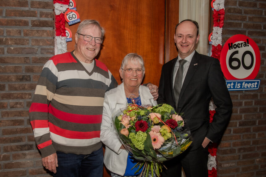 Het is vandaag precies 60 jaar geleden dat meneer A. Arendonk (83) en mevrouw J.P.M. Arendonk‑Barendregt (80) in het huwelijksbootje stapten. Wethouder Adriaan van der Wulp ging vanochtend langs met een mooie bos bloemen. Hij feliciteerde hen namens het gemeentebestuur met dit diamanten jubileum.
