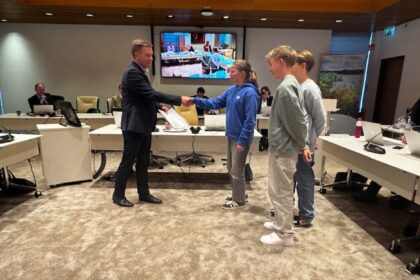 Leerlingen bieden petitie voor het behoud van het Rhoonse Veer aan tijdens raadsvergadering Hoeksche Waard