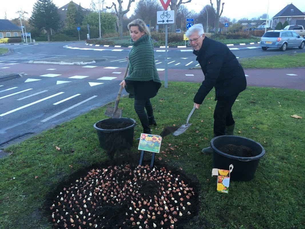 Wethouder Piet van Leenen plant tulpenbollen in de gemeente Oud-Beijerland die straks bloeien in de gemeente Hoeksche Waard