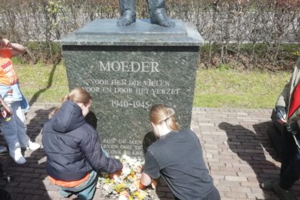 Leerlingen van Het Anker leggen bloemen bij het monument ‘Moeder in Heinenoord ’