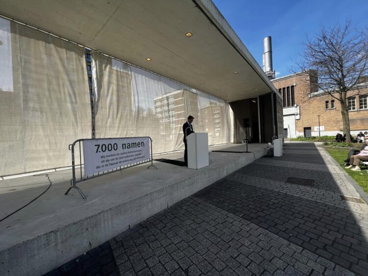 Wethouder Boogaard leest namen vermoorde joden uit de Hoeksche Waard voor op het Stadspodium bij de Laurenskerk in Rotterdam