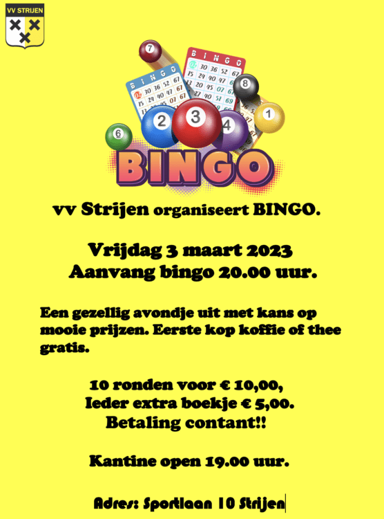 v.v. Strijen organiseert voor de bingo liefhebbers op vrijdagavond 3 maart weer…