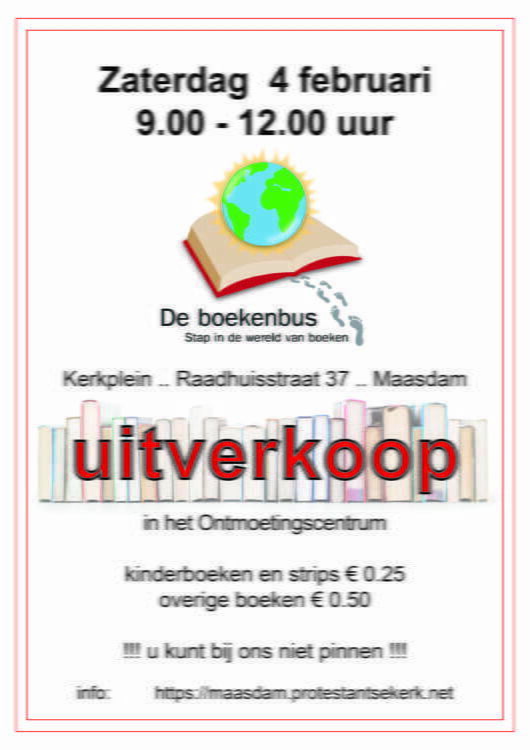 De boekenbus komt op zaterdag 4 februari naar Maasdam en uitverkoop boeken in het ontmoetingscentrum van Maasdam