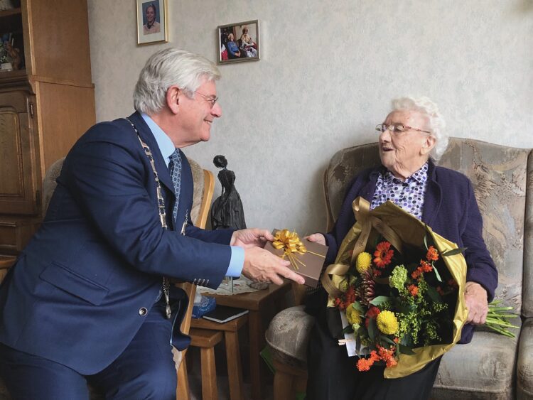 Bloemen en bonbons voor 102-jarige mevrouw Van der Linden-de Wit uit Westmaas