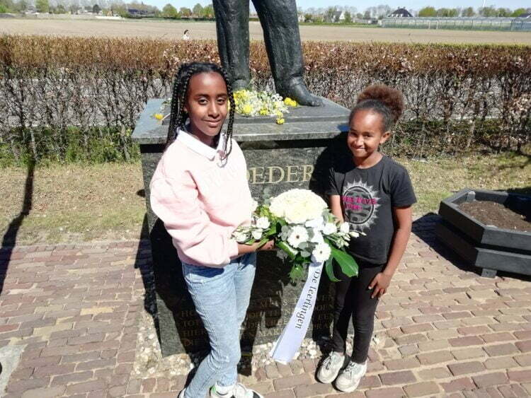 Leerlingen van Het Anker leggen bloemen bij het monument ‘Moeder’
