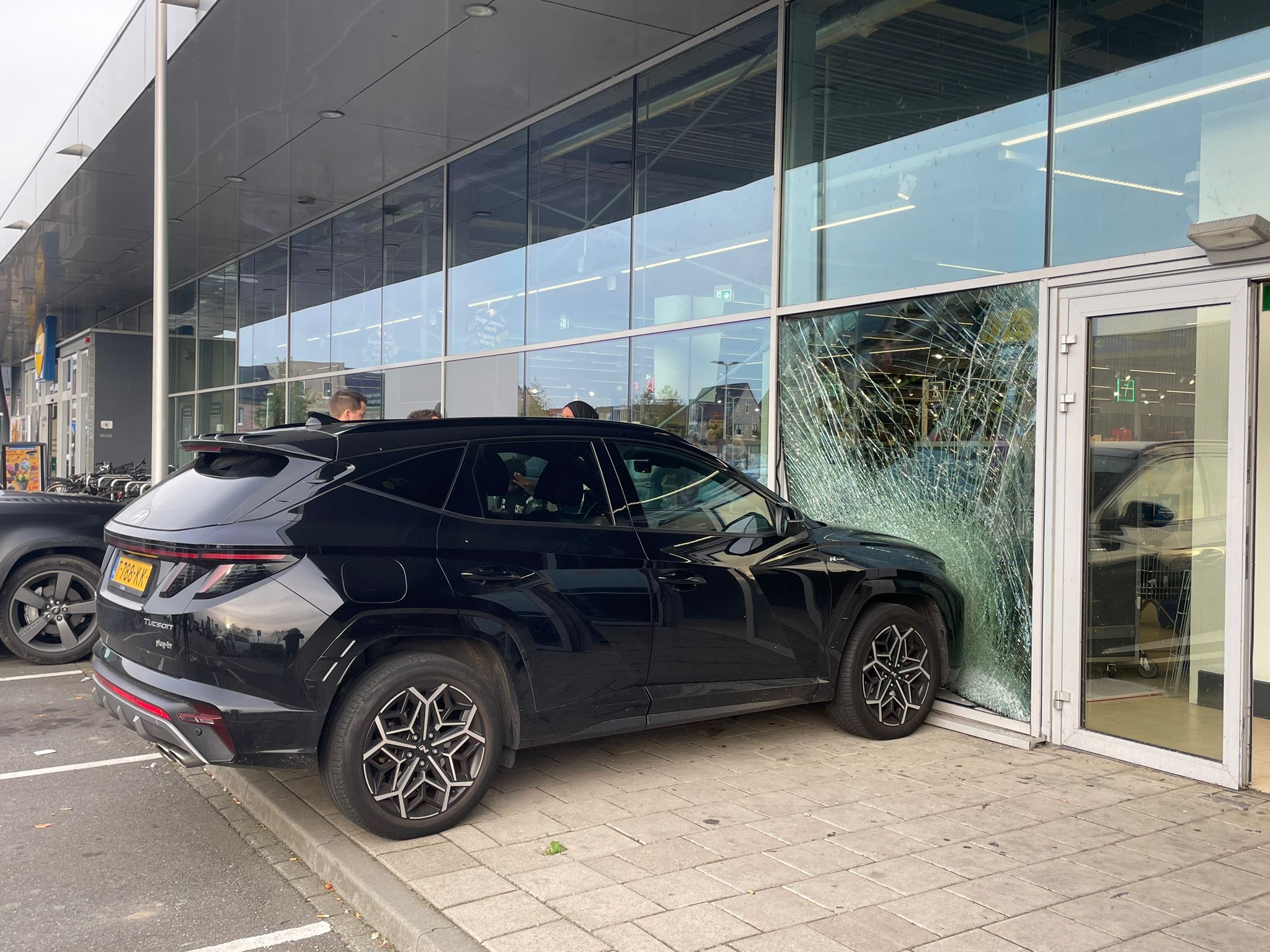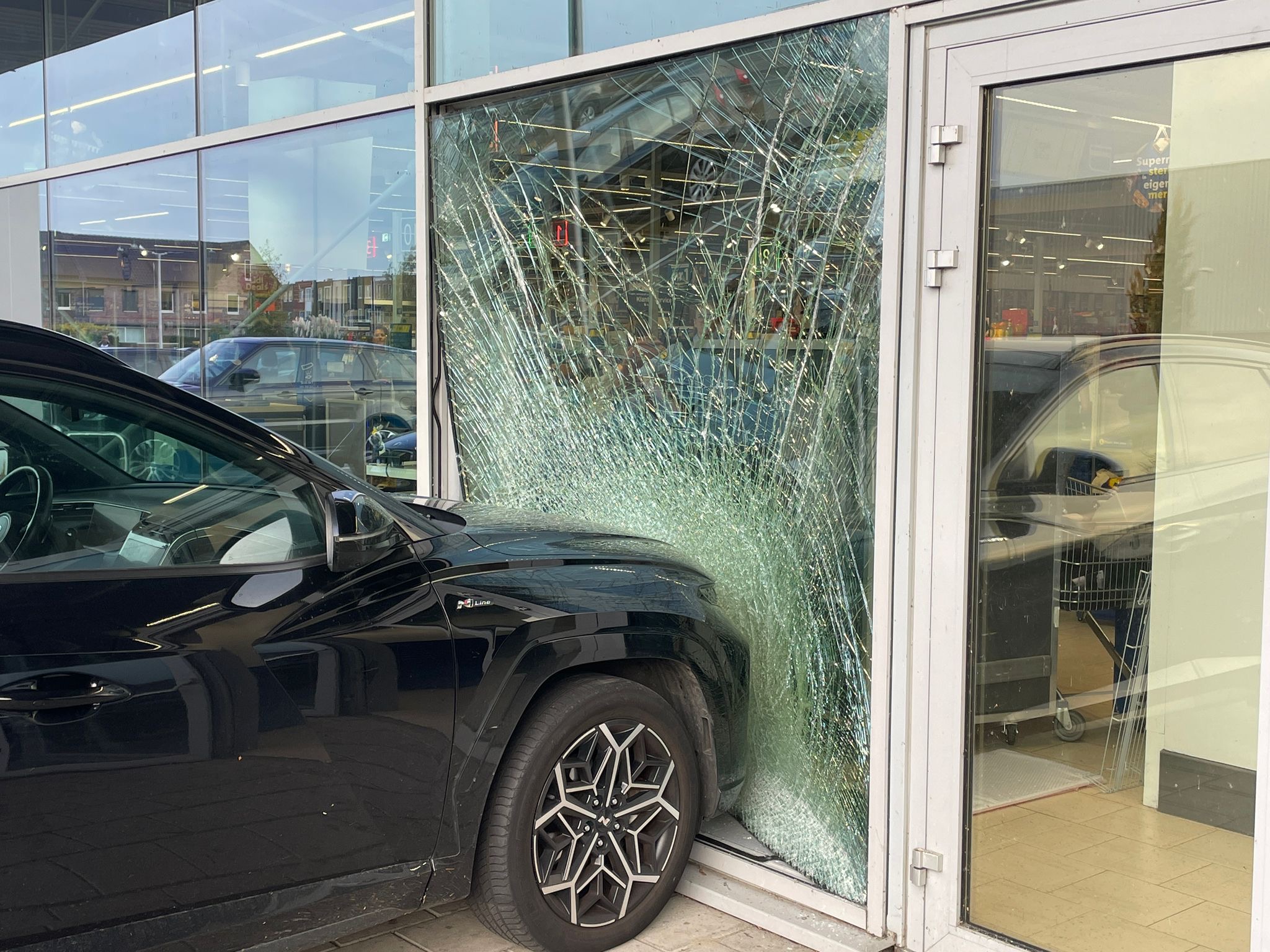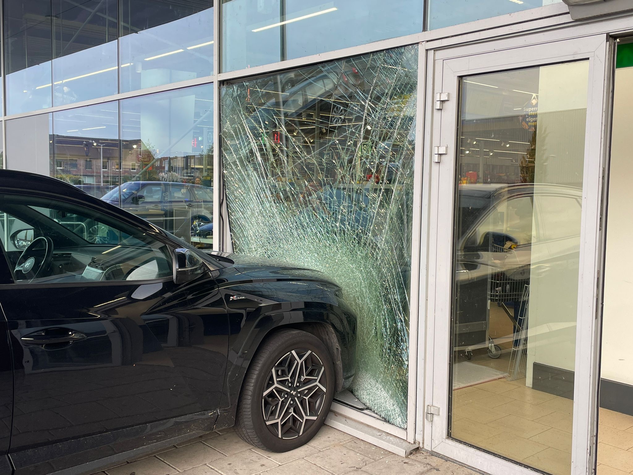 Een bergingsbedrijf zal het beschadigde voertuig afvoeren. De supermarkt liep schade op aan de gevel, maar kon na het incident grotendeels open blijven.