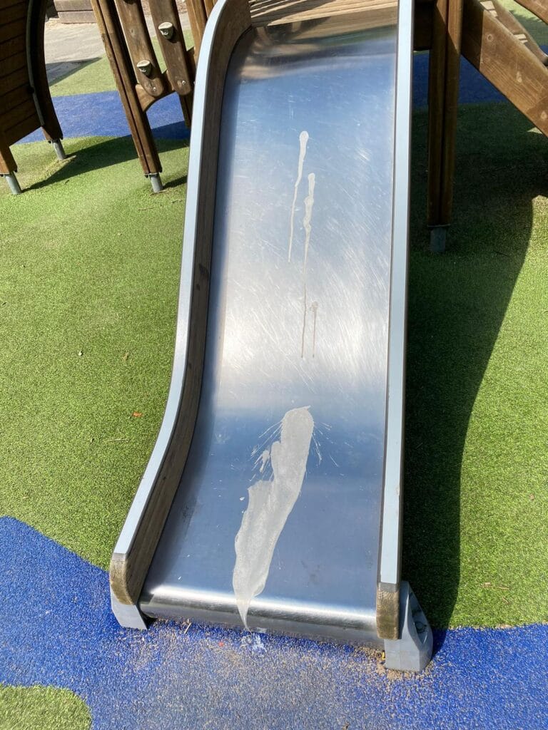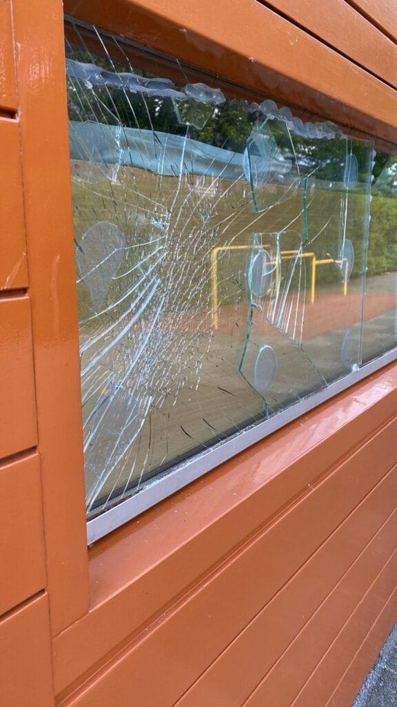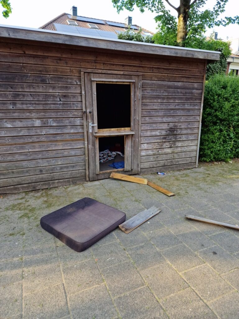 Het afgelopen Hemelvaartweekend was een triest dieptepunt waarbij de deur van een opbergschuur het moest ontgelden met als gevolg dat ook de nodige speelmaterialen werden vernield. Ramen met stenen in gegooid, speelmaterialen besmeurd of kapot gemaakt, eieren tegen ramen gegooid en een hoop vuilnis en glas op het plein achtergelaten.