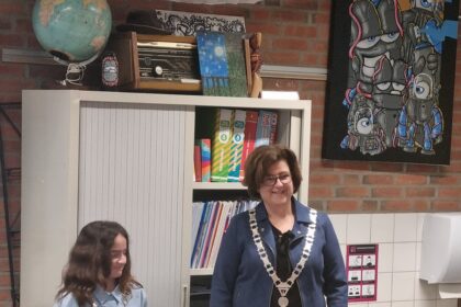 Burgemeester Witte en kinderburgemeester Sparreboom in gesprek met groepen 8 van De Bouwsteen in ’s-Gravendeel
