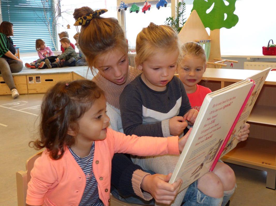 Leerlingen de Bouwsteen lezen voor aan de kleuters