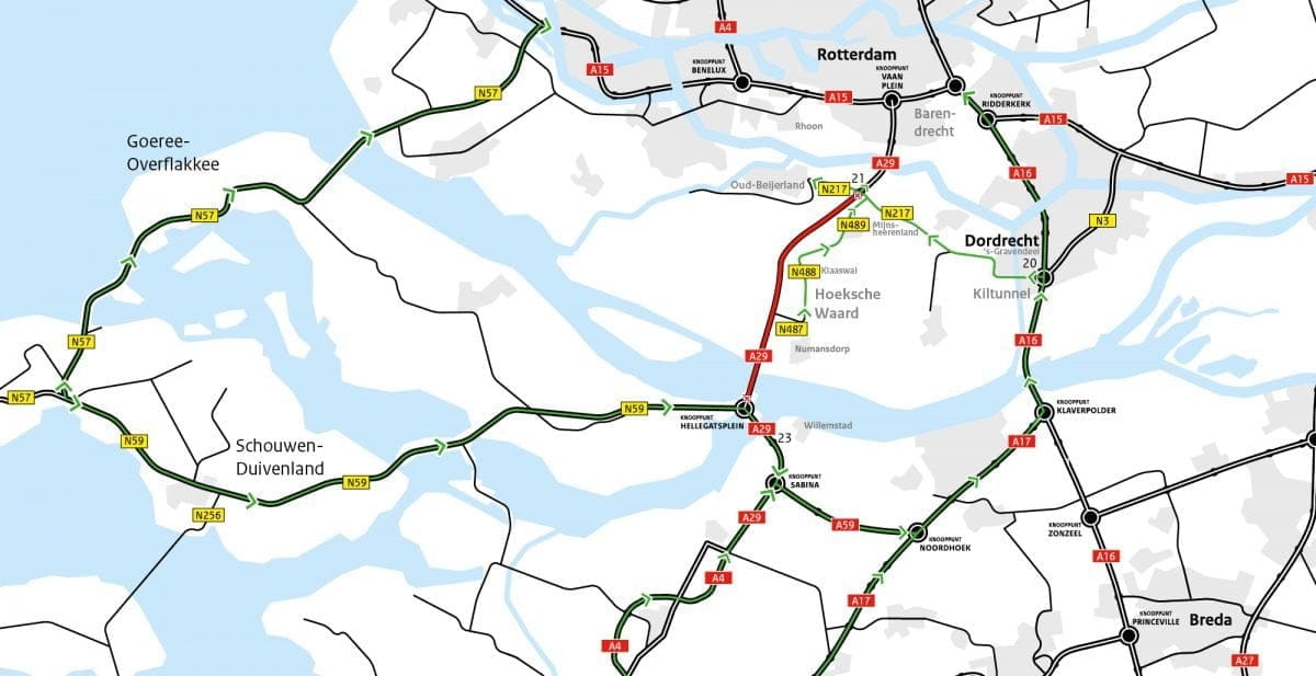 A29: werkzaamheden tussen Bergen op Zoom en Rotterdam van 21 tot 24 september 2018, Kiltunnel van Oost naar West Tolvrij