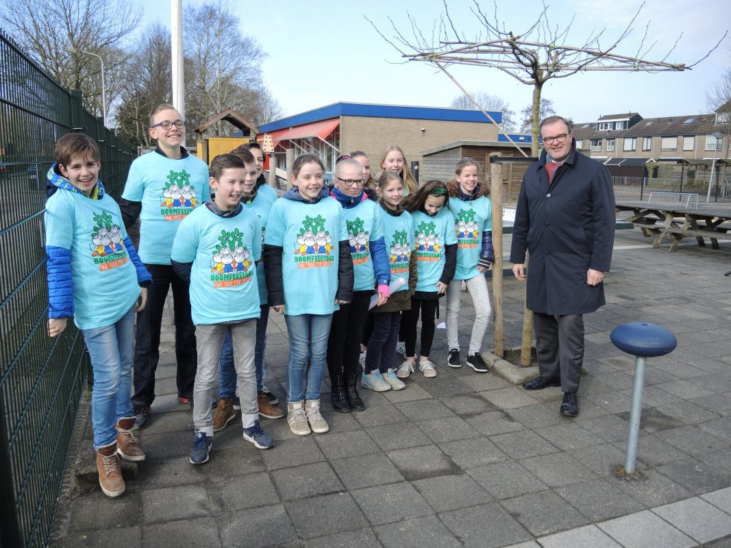 Leerlingen cbs de Hoeksteen planten samen met wethouder van Leenen bomen tijdens de boomfeestdag!