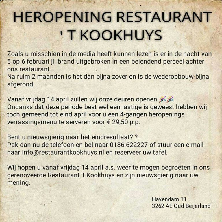 OUD-BEIJERLAND - Vrijdag 14 april gaat Restaurant ’t Kookhuys na de brand op de…