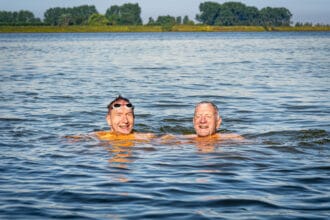 Ad Konijnendijk (90 jaar) duikt het water in met burgemeester Erik van Heijningen