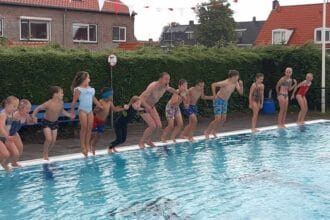 Klaaswaalse kinderen laten zich ondanks het weer niet tegenhouden: gewoon een bommetje met de burgemeester van Heiningen tijdens de zwemdisco!